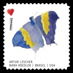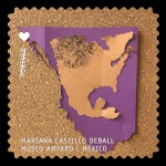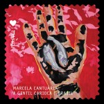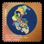 Each stamp artwork created for THESE TIMES features an original design with the name of the artist, the art institution or gallery where the artist currently has or had an exhibition, and the country. The 1.3 x 1.3 inch stamps include text in Spanish, English, and Portuguese.