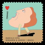 MARCELO CIPIS (b. Sao Paulo, Brazil, 1959) @cipismarcelo1; In this seal, we see a surrealist figure, an unpredictable being made up of a large head and tiny legs, devoid of a body. More than Deleuze’s “body without organs”, here we have a bodiless person looking for a heart, like the lion of the Wizard of Oz. In these very unusual times, it is important to think about our existence in a broader and deeper way. Being at home has become as real as being inside – that we can inhabit our bodies, our homes and care for one another.